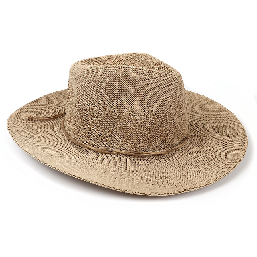 Recycled buff packable summer fedora hat with diamond crown weave and cord trim.